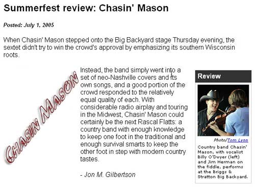 Chasin’ Mason has achieved tremendous success with their fans in the Midwest while performing at Summerfest, Country Fest, Country Thunder, and Country USA.